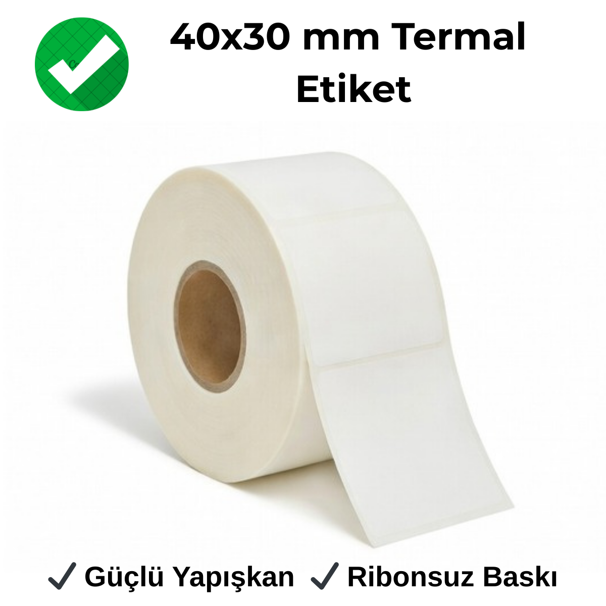 40x30 mm termal etiket; küçük ve orta boy ürünlerde fiyat, barkod ve stok kodu basımı için ideal ölçüdür. Ribonsuz baskı uyumludur ve perakende ile e-ticaret operasyonlarında yaygın olarak kullanılır.